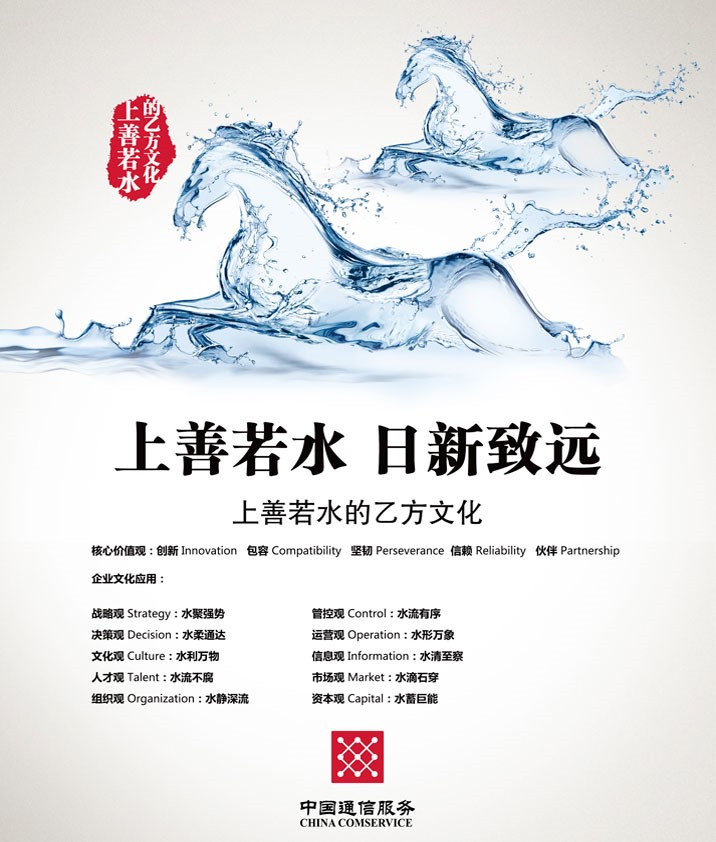 中國通信服務將水的至善品格融入到公司文化及經營發展當中:以 "重信賴、尚智慧、利萬物" 文化內涵和 "創新、包容、堅韌、信賴、伙伴" 的文化品格,在信息化領域中通過打造一體化的總承包服務能力,向客戶提供綜合信息網絡建設解決方案,從而整體實現股東、員工、行業、客戶和社會的價值,以幫助別人贏得自己成功。
