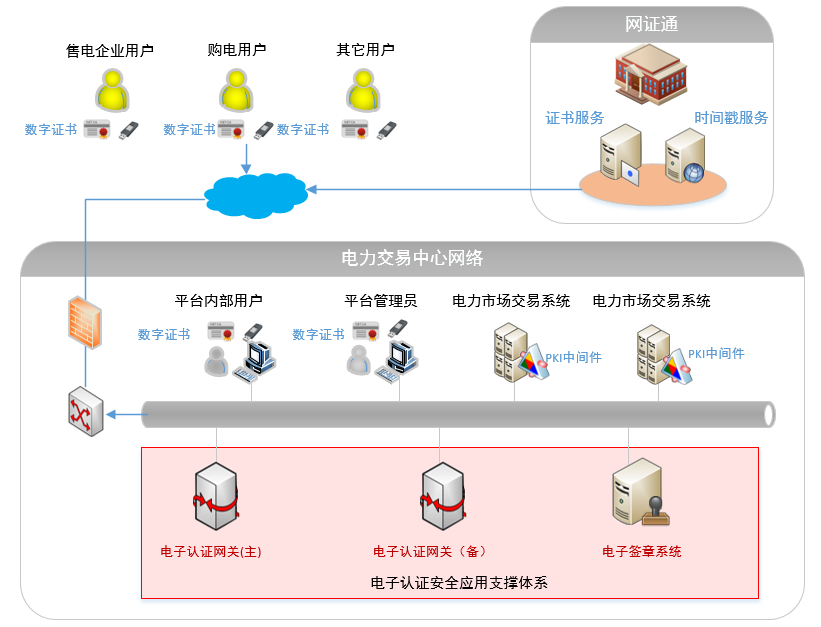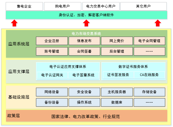 引入合法第三方CA電子認(rèn)證技術(shù),搭建電子認(rèn)證支撐平臺(tái),與電力市場(chǎng)交易系統(tǒng)有機(jī)結(jié)合,解決電力交易的身份認(rèn)證安全、數(shù)據(jù)傳輸安全、網(wǎng)上報(bào)價(jià)保密、網(wǎng)上合同簽署的合法性等安全需求。